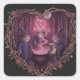 This square sticker features whimsical frog witches stir a glowing cauldron in a moonlit enchanted forest, framed by a heart-shaped rose and thorn vine—romantic, magical illustration.