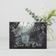 This Save the Date wedding announcement features an enchanting gothic graveyard scene in shades of grey. The old gravestones are scattered about with string lights hanging from haunting trees.