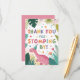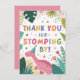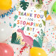 Express your gratitude with these adorable dinosaur-themed thank-you cards! Featuring a cheerful pink dino wearing a party hat, vibrant tropical leaves, and playful text that says, "Thank You For Stomping By!"—these cards are perfect for sending heartfelt thanks to your party guests. The colourful and whimsical design makes them a delightful keepsake for any dino-themed celebration. Add a personal touch with your message inside to make your guests smile!