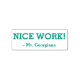 This motivating rubber stamp design features the positive message "NICE WORK!" and a custom teacher's name. It could be used by a teacher, educator, or tutor when grading student work, to acknowledge that a student has done an exceptional job.