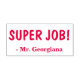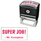 This motivating rubber stamp design features the motivational message "SUPER JOB!" and a customized educator's name. It could be used by a teacher or educator when marking assignments, to acknowledge that the student has done a great job.