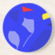 This sandstone coaster exhibits an electric blue background image, from which light blue, orange, navy and yellow leaves emerge.