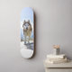 The skateboard features a visual design of a energetic Siberian Husky. The skateboard is adorned with a graphic representation of a Siberian Husky walking, capturing the image of this energetic and athletic dog. The choice of this design aims to convey a sense of dynamism and vitality, as the Huskies are known for their energy and enthusiasm. The combination of the form of transport, the skateboard, and the moving Husky image creates an interesting fusion between the functionality of the object and the artistic expression of design.