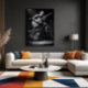 A guitarist explodes into motion, playing an electric guitar, with a full band in the background. Dramatic lighting and monochromatic tone capture the intensity of a live show.
