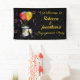 Stylish Engagement party banner featuring an ice bucket with bottle, flute glasses balloons, and confetti all on a black background with colourful confetti. The names of happy couples in a script text welcoming guests to their party to celebrate their engagement. All text can be amended to customize and personalize the banner. Oh and congratulations.