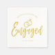 A fun and unique script lettered napkin tailored specifically to you an engagement party. It features the word engaged with wedding rings resting about it. Underneath this and above it are the names of the bride and groom and the engagement date.