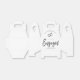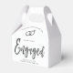 A fun and unique script-lettered paper gable box tailored specifically to your future engagement party. It features the word "engaged" with wedding rings resting over it. Underneath this and above it are the names of the bride and groom and the engagement date. Towards the bottom of the front of the box is a spot for your unique message to your guests.