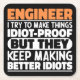 Funny Engineer Sayings "Engineer I Try To Make Things Idiot Proof But They Keep Making Better Idiots". Grab this Funny Engineer design as a funny gifts for an awesome mom, dad or friend.