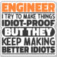 Funny Engineer Sayings "Engineer I Try To Make Things Idiot Proof But They Keep Making Better Idiots". Grab this Funny Engineer design as a funny gifts for an awesome mom, dad or friend.