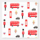 Doubledecker bus, guardman, queen and telephone booth in a cute pattern of England symbols. | © and ® Bigstock® - All Rights Reserved.