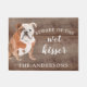 Funny beware of the wet kisser" English Bulldog Dog door mat set on a rustic faux background. Visit our shop to view a large assortment of dog breads