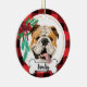 Bulldog ornament with red buffalo background and Christmas garland and bow - Art was hand painted by me and made available as this adorable ornament! Add any text (suggested: "I ❤️ my bulldog" or your sweeties name)