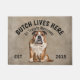 English Bulldog Personalized Dog lover welcome doormat. This welcome mat can be personalized with your dog’s name, the slogan can also be changed or you could use a picture of your own dog (make sure it's transparent). Text reads: Butch lives here…. All treats welcome