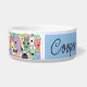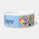 For stylish dogs, this dog bowl features a modern cartoon collage of dogs and a picture of your an English Bulldog and the dog’s name.