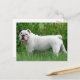Aww...who can resist the face of an English Bulldog Pup? This postcard features a white Bulldog puppy dog walking in the tall green grass. He is ready to help you send greetings to your friends and family.