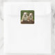 This fun canine sticker features an image of two adorable English Bulldog puppies standing on a wood log with a green woodsy background.