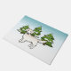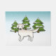 Destei's original cartoon illustration of a cute English cream colour Golden Retriever breed dog. The dog is placed in a cold winter scene. In the scene it is snowing in the background and there are three green fir trees behind the dog. The trees have some snow on them. The background is a light blue to white gradient giving this design that freezing cold winter day look.