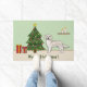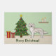 Destei's original cartoon illustration of a cute English cream colour Golden Retriever breed dog. The dog is standing by a festive Christmas tree decorated with red and yellow ornaments, a white pearl garland and a yellow star that is placed on the top of the tree. There are also two wrapped presents by the tree and behind the dog there is a brown shelf with two candles. The floor colour is beige and the background colour is light green. There is also a personalizable text area that now reads: "Merry Christmas!".