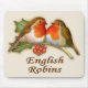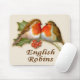 Two plump English Robins sitting on a Holly twig with red berries. Text says English Robins.