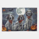 Unleash the spooky spirit with this eerie Halloween design featuring a pack of dogs under a dark, moonlit sky, surrounded by flying bats and glowing pumpkins. Perfect for those who love a touch of frightful fun with their furry friends!