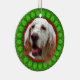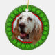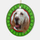 A beautiful English Setter decked out in a bright red and green Christmas wreath.