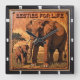 This appealing square wall clock features a dimensional illustration of a mother elephant and her baby standing together on the African savannah. The entire design has a warm, wood-carved appearance, strongly suggesting an Engraved Wood Look. The elephants are rendered in textured brown and copper tones, contrasting with the pale, textured orange and yellow sunset sky behind them. A distinctive acacia tree is visible in the background. The large, three-dimensional embossed text "BESTIES FOR LIFE" is carved across the top center. The clock face features a simple clock face border with large, white, numbered tick marks (1 to 12). The artwork is surrounded by a dark, textured decorative border that resembles a black wood frame.