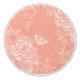 Romantic white roses, butterflies, filigree swirls and leaves embellish this design on a softly distressed pink damask background.