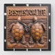 This striking square wall clock features a highly dimensional illustration of two sea turtles standing upright side-by-side. The entire design is rendered in rich brown and orange tones, strongly suggesting a carved relief or Engraved Wood Look. The turtles have highly detailed, textured shells and limbs, and are positioned on a textured sandy ground. The background is dominated by a flat, highly stylized wood grain or wave pattern texture. The large, three-dimensional embossed text "BESTIES FOR LIFE" is carved across the top. The clock face features a simple clock face border with large, white, numbered tick marks (1 to 12) integrated into the frame. The artwork is surrounded by a dark, textured decorative border that resembles a black wood frame.