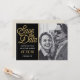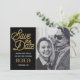 La carte postale non traditionnelle Save the Date Mariage a un script or moderne contre un arrière - plan noir. Votre photo en noir et blanc est complétée par cette faire-part audacieuse.