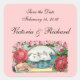 Custom Save the Date autocollants avec des lettres de script et un beau art victorien vintage d'une paire d'élégants cygnes blancs flottant sur un lac encadré de roses rouges et de fleurs d'oubli-moi-pas rose. Cliquez sur Customiser pour modifier le dimensionnement, la forme ou les couleurs arrière - plans, et même enregistrer votre conception pour plus tard.
