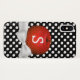 Joli coque iPhone X avec des graphiques d'un petit motif de fleurs sur rouge juteux, contre un arrière - plan de pois noir et blanc. Les graphiques d'un ruban blanc et d'un arc courent à travers le fond de la pomme. Personnalisez le monogramme d'une lettre blanche. Idéal pour vous-même ou comme une idée cadeau pour votre professeur préféré.