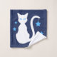 Un ensemble de serviettes avec un chat blanc sur un arrière - plan de bleu marine. Les deux plus grandes serviettes ont le chat dans le coin avec un profil sous convention astérisque de bleu glacier sur le reste de la serviette. La lavette a le chat comme conception centrale.