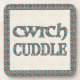 Ensemble de six dessous de verre intelligents avec le mot gallois 'cwtch', signifiant 'cuddle' ou 'hug' dans un script celte, ainsi que 'Cuddle' en anglais, dans un motif ethnique rouge et bleu sur un arrière - plan à effet lin.