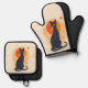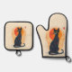 This oven mitt and pot holder set features a black cat decorated with Zentangle lines, with an orange sun behind it, and superimposed on a keyhole shape with random orange chips. An unusual design, reminiscent of Aubrey Beardsley's work, and perfect for anyone who loves cats.