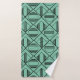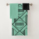 Ce kit de serviettes comprend une serviette de bain avec un design art déco de diamants à l'intérieur de diamants avec des lignes verticales et des cercles avec des lignes horizontales sur un champ de turquoise, un linge noir, et une serviette à main turquoise.