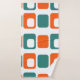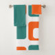 Ce kit de serviettes est doté d'une serviette de bain au design moderne du milieu du siècle : rectangles orange répétitifs, rectangles blancs à l'intérieur alternant rectangles turquoises, linge orange et serviette turquoise.