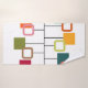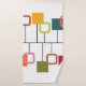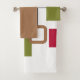 Ce kit de serviettes est doté d'une serviette de bain au design moderne du milieu du siècle qui ressemble à un mobile avec des carrés solides et ouverts accrochés à celui-ci en turquoise, orange, vert, rouge et beige, un linge vert et une serviette de bain beige.