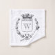 Habiller votre salle de bain dans un style campagnard français chic avec cette serviette personnalisée avec un monogramme vintage "maison de" crête et votre nom de famille flanqué sur les côtés par des bandes à ruban adhésif aqua.