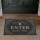 Greet your guests with this spooky-chic Halloween doormat! Design features a black background with your name curved across the top, and "Enter if you dare" beneath. A filigree border and a skeleton accent complete this spooky Halloween design.
