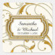 NOTE: This is a flat printed image, there are no jewels, raised layers or gold metallic elements. COLOR PALETTE: black, soft creamy white with faux gold metallic glitter look DESIGN COLLECTION: Matching envelope back seal, favour bag stickers, or use for DIY cupcake toppers. Inspired by Old Hollywood and her heyday glam era, this wedding invitation set is perfect for elegant, sophisticated, modern wedding celebrations. A classic, beautiful swirling leaf damask style pattern has been graphically designed to look like a silver edged gold glittery embroidered lace design with a golden buckle that has a diamond border over faux glitter. A contemporary typography layout for your invite wording and information updates this vintage retro design. A gorgeous, unique and pretty design for the most discriminating bride.