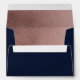 Une enveloppe bleu marine 5x7 avec une feuille d'or rose en faux Lining Inside. Cette élégante et brillante enveloppe métallique rose or classique bleu tout usage est une façon classe d'envoyer des invitations. Vous pouvez customiser et personnaliser votre nom et votre adresse sur le rabat arrière. Idéal pour les invitations d'occasions spéciales, merci cartes, annonces ou utilisation quotidienne.