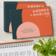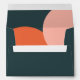 Une enveloppe de mariage boho moderne donnant une ambiance rétro lumineuse et amusante avec ses motifs abstraits en arc super éclatant une pop de couleur orange, bleu foncé vert et pêche lettré avec des polices audacieuses.