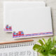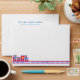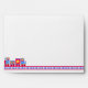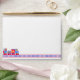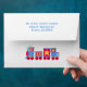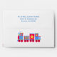 Colorful choo choo train thème baby shower invitation enveloppe. L'extérieur de l'enveloppe est blanc, avec des graphiques mignons d'un train de jouets bleu, rouge, vert et jaune, à l'avant et à l'arrière de l'enveloppe, avec l'intérieur fait dans un motif de pois bleu et blanc. Personnalisez l'adresse de retour bleue, sur le rabat arrière de l'enveloppe. Des produits de baby shower correspondants sont disponibles.