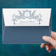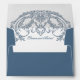 Cette enveloppe a un panneau extérieur inférieur bleu français avec un motif de crête monogramme sur le rabat extérieur. Le nom et l'adresse de retour se trouvent sur le rabat extérieur dans une police bleue. Cette enveloppe coordonne avec les autres produits de la collection Mariage baroque de Monogramme Bleu Bleu.