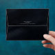 Optez pour un look éblouissant, éblouissant et glamour en utilisant les pièces de cette suite mariage comme indiqué, avec des bijoux en cascade des feuilles de palmiers incrustés de diamants ou supprimer les couches de bijoux pour un look un peu plus conservateur. Cet ensemble présente des feuilles en or rose chatoyant contre un arrière - plan bleu marine foncé texturé.L'enveloppe de coordination montrée ici a l'intérieur dégoulinant avec des bijoux étincelants et un extérieur texturé dans les tons bleu marine foncé. Entrez facilement vos noms et votre adresse de retour en utilisant le modèle fourni. Affichez le lien de collection sur cette page pour voir tous les éléments correspondants dans ce bel ensemble ou recherchez ID830 pour voir d'autres options de couleur pour cette conception.