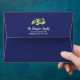 Belle enveloppe bleue de Noël avec votre adresse de retour imprimée sur le rabat avec une doublure de vert sauge, fleurs blanches, baies bleues, votre nom dans un script blanc et votre adresse en dessous. Joyeux écrit sur la doublure avec de belles branches de baies de feuilles verts et de fleurs blanches. Pour la saison des fêtes, lettres de Noël, mariages de Noël, et plus.