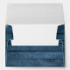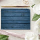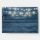 Une enveloppe rustique élégante décorée de jolies lampes à cordes sur un arrière - plan de bois rustique bleu avec vos noms et adresse de retour ensemble dans la typographie chic. Conçu par Thisisnotme©