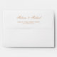 Enveloppe de réponse de couleur ivoire simple et formelle avec une écriture calligraphiée classique en or sur le rabat. Vos proches peuvent mettre leur réponse à l'intérieur et vous l'envoyer. Utilisez le bouton de personnalisation sur le côté droit pour modifier les noms des mariés et les informations d'adresse de leur domicile. Minimaliste. Mariage moderne. Modèle personnalisable. Choisissez la taille de l'enveloppe pour la rendre unique. Contactez le concepteur pour toute modification spéciale de ce produit.
