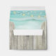 Voici des enveloppes assorties pour les cartes RSVP de mariage rustique des lumières à cordes océaniques de plage. Bois patiné rustique encadre une scène de plage, avec des lampes à cordes pour la décoration. Ce design côtier rustique est facilement personnalisé pour votre journée spéciale, et est également parfait pour d'autres événements rustiques sur la plage.