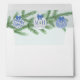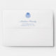 Design d'enveloppes avec une bille de style chinoiserie bleue et blanche sur le rabat à l'envers, avec le nom et les détails de l'adresse de retour. L'intérieur (liner) est un arrière - plan vert très pâle avec une branche de sapin avec 3 ornements bleus et blancs, dont le centre est le monogramme des couples. Les ornements étaient à l'origine peints à la main par moi en aquarelle avant d'être scannés sous forme numérique. J'ai des invitations, des cartes de fin de année, des étiquettes cadeaux et d'autres articles qui correspondent à ces enveloppes.